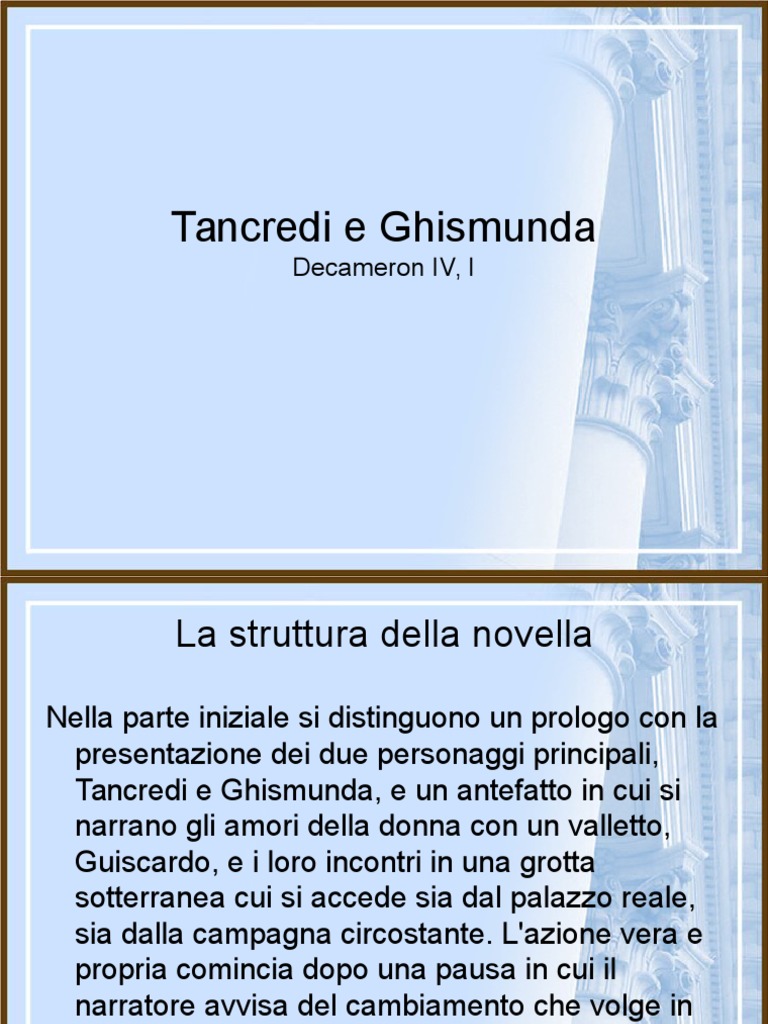 Tancredi ama tanto ghismunda e non vuole che lei si sposi ma alla fine deve accettare il suo ghismunda promette che si suiciderà se il padre uccide guiscardo, ma lui non le crede, lo uccide e le. Tancredi e ghismunda decameron iv i ppt video online scaricare. Trama sintetica e collegamento con le tematiche dell'opera. Tancredi infatti, principe di salerno, uccide guiscardo, l'amante dell'amata figlia. Durante la quarta giornata, dedicata alle storie di amori infelici,di cui è re filostrato, fiammetta narra come prima novella la triste storia che ha per.